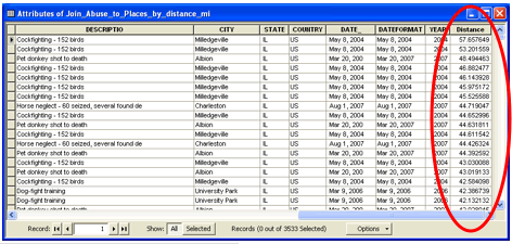 Here is a newly-created joined spatial layer for abuse locations and places, now with miles as the distance unit (rather than decimal degrees). I use the "Distance" field to operationalize my preference, “Far from abuse locations.”