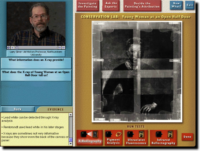 The "Is it a Rembrandt?" program, built in collaboration with Professor Larry Silver, formerly of Northwestern University's Art History Department, introduces art history students to these issues by having the student determine the authenticity of three Rembrandtesque paintings. By inspecting the painting, running laboratory tests, and asking art experts questions (via a video archive of over 450 clips), students gather evidence that they later use to argue for an attribution. Throughout this process students encounter the complex issues surrounding connoisseurship and attribution, and learn more about both painting in general and Rembrandt in particular.